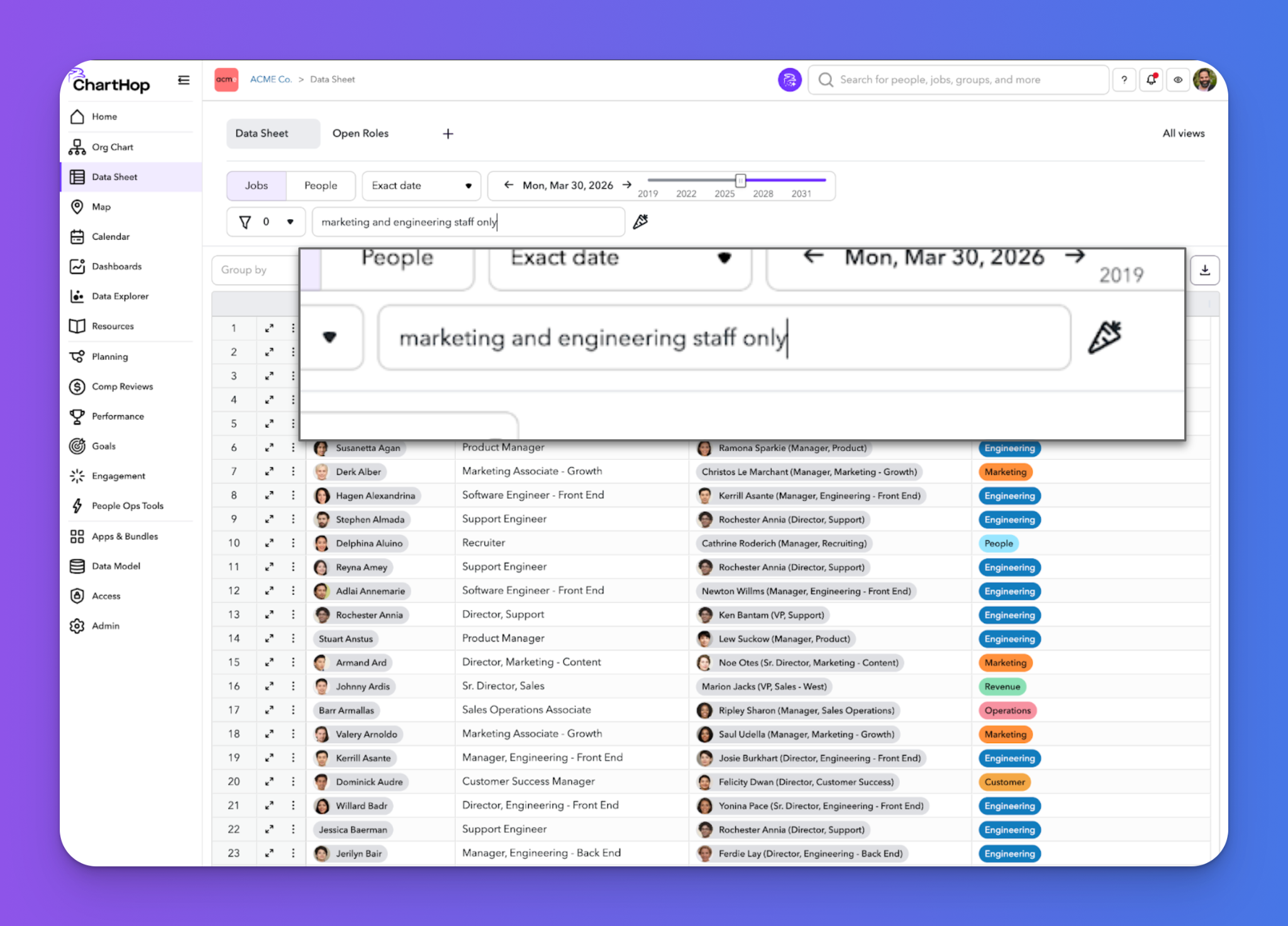 Have you ever marveled at the power of ChartHop CQL but felt intimidated by the syntax? With Natural Language Filtering, you can now simply describe what you want in plain language and ChartHop will translate it into valid CQL for you!